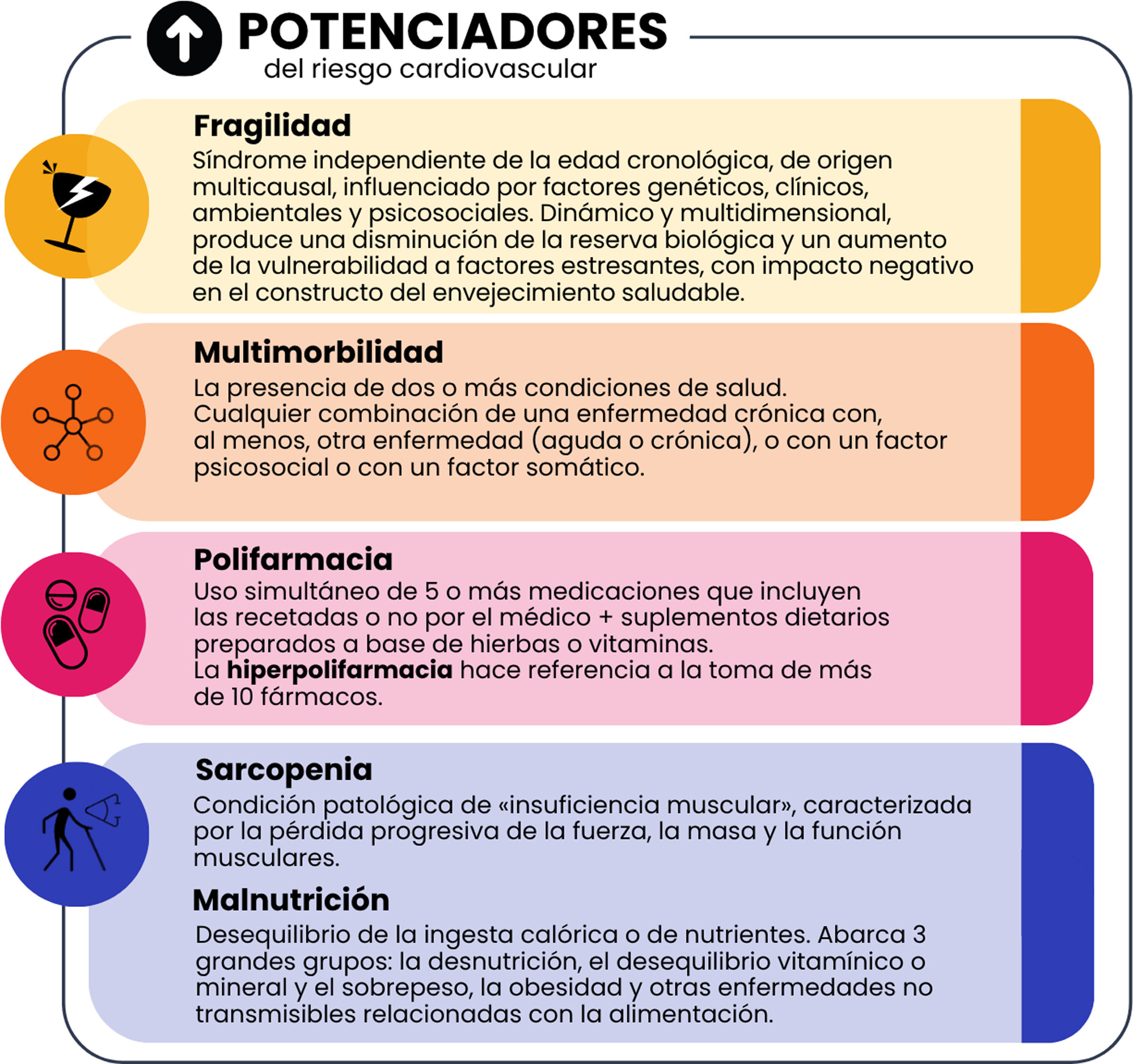 El envejecimiento poblacional continúa en aumento a nivel mundial. Los síndromes geriátricos, prevalentes en las personas mayores y descritos desde hace varios años por la geriatría, hacen referencia a diferentes estados de salud. Muchos de ellos han sido incorporados y evaluados en estudios cardiológicos, potenciando la posibilidad de eventos cardiovasculares adversos, término que acuñamos como síndromes cardiogeriátricos. Dentro de ellos destacamos la fragilidad, la multimorbilidad, la polifarmacia, la sarcopenia y la malnutrición. Otros pueden determinar y predisponer la mala evolución de enfermedades cardiovasculares. La presente revisión hace foco en aquellos síndromes geriátricos potenciadores y determinantes del riesgo y su impacto cardiovascular.