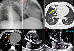 Ingresa en la unidad de cuidados intensivos pediátrica, donde se completa el estudio con ecocardiografía, que muestra un derrame pericárdico grave (fig. 1E, estrella), con signos incipientes de compromiso hemodinámico, y una masa hiperecogénica oscilante, sugestiva de hematoma pericárdico (fig. 1F y vídeo S1).