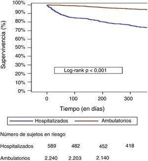 En la tabla 3 y la tabla 4 se presentan los tratamientos recibidos en la visita basal (en el momento del alta en el caso de los pacientes ingresados) y en el seguimiento al año. Basalmente, los pacientes ambulatorios recibieron más frecuentemente todos los fármacos estudiados que los pacientes ingresados, con la excepción de diuréticos, nitratos, antagonistas del calcio y anticoagulantes, en los que hay una mayor proporción de pacientes que los recibieron entre los ingresados (comparaciones no incluidas en la tabla). Es de destacar que apenas hubo cambios en ninguno de los 2 grupos entre la visita basal y el seguimiento al año.